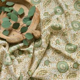 The blurred lines and organic dots of this stylised floral motif noted characteristics of the original block print have been cleverly captured using the latest digital printing techniques. Presented on gorgeous, slubby linen fabric.