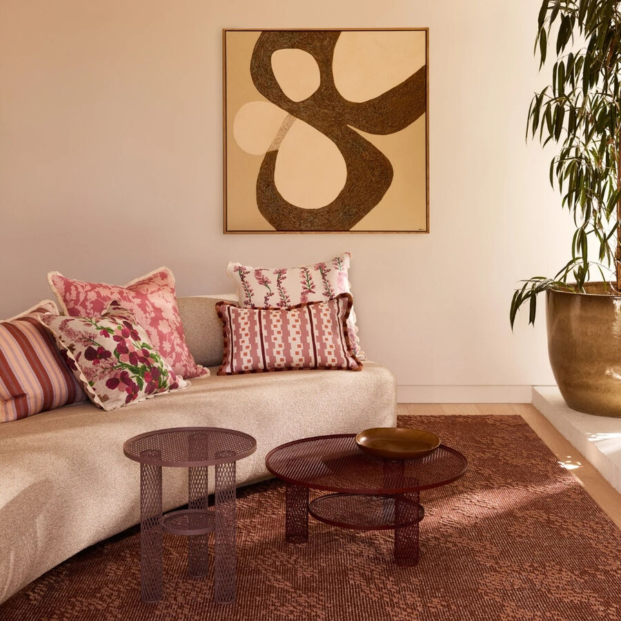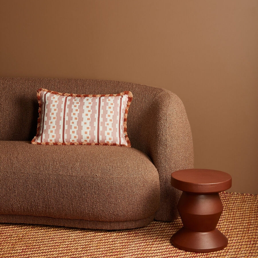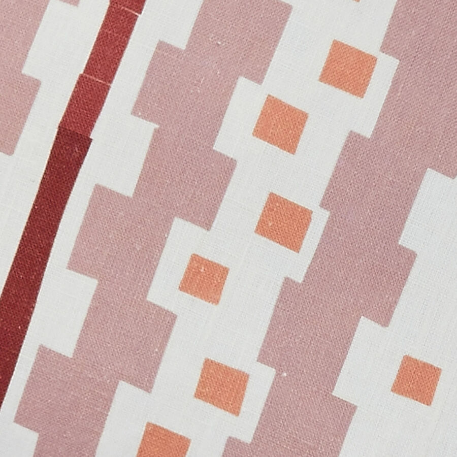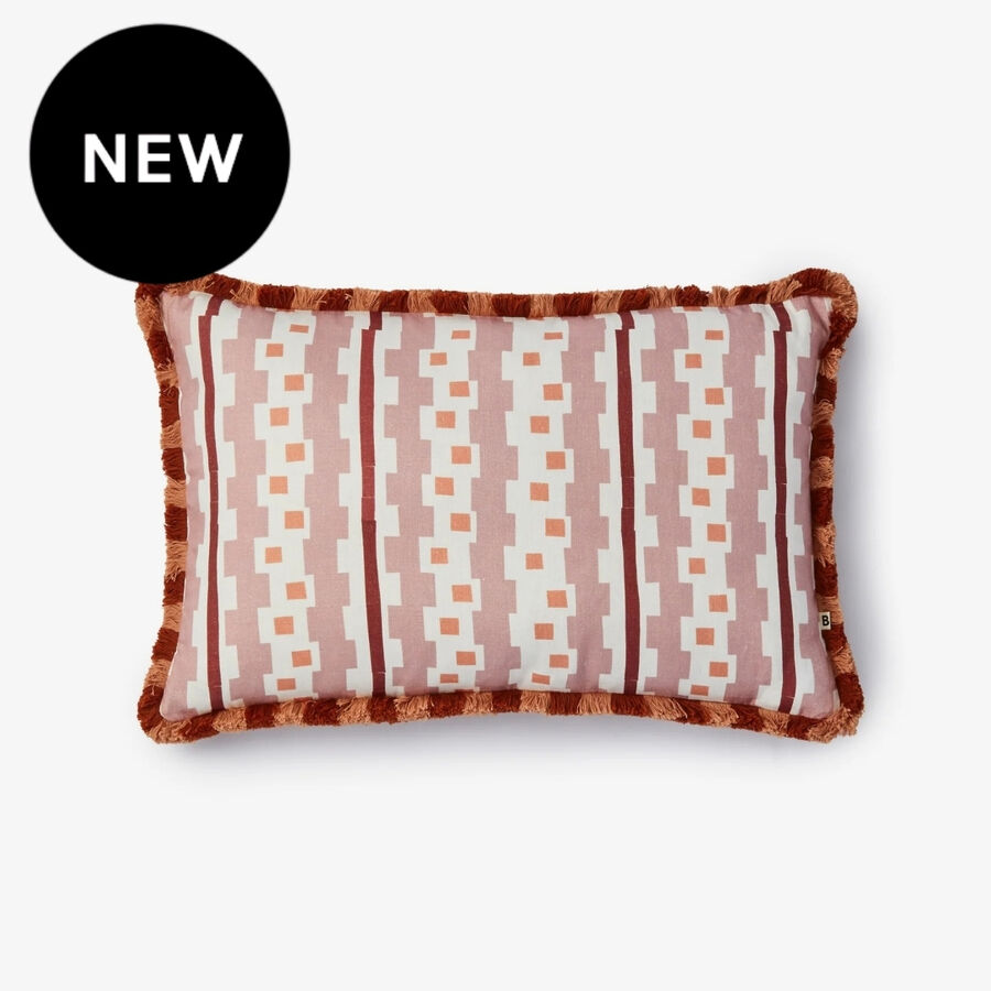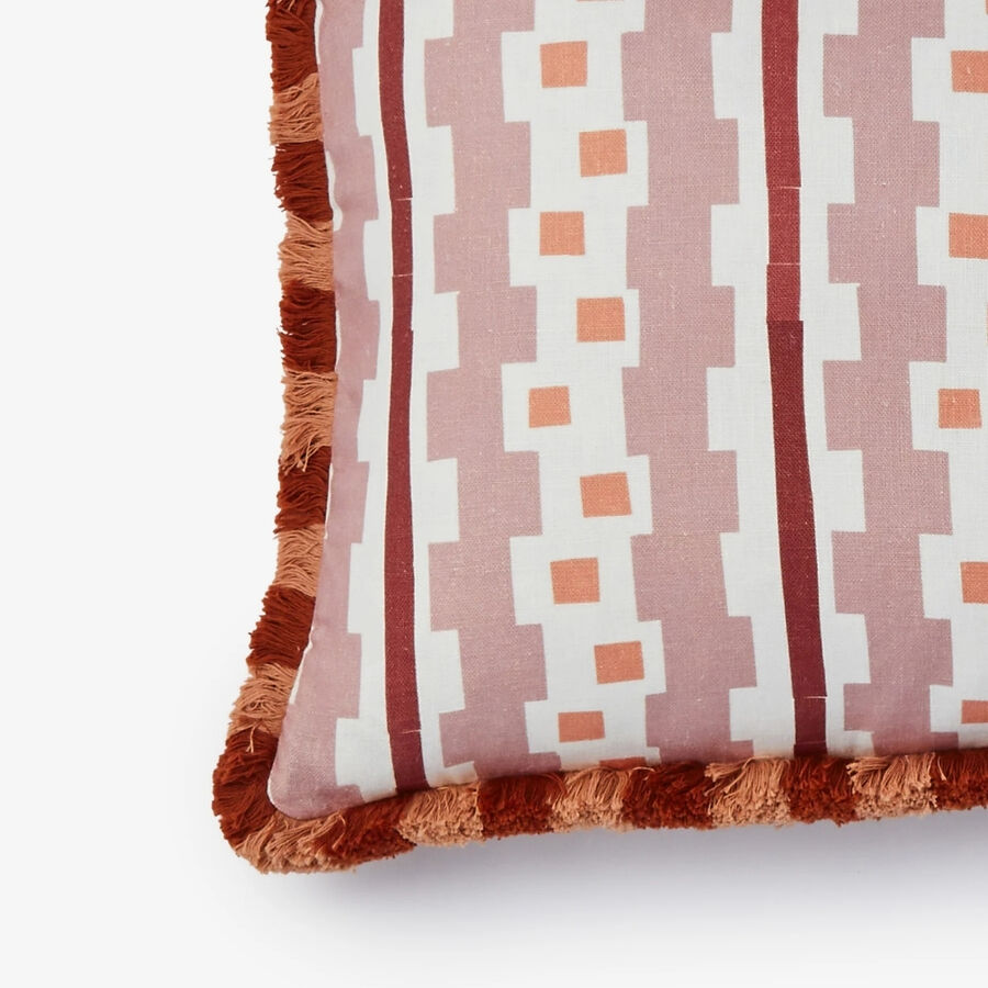 Inspired by Bauhaus-era weaving, this buff pink linen cushion features bold geometric patterning and a stripe fringe. Structured yet tactile, it brings art-led design to interiors.