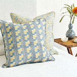 As lovers of woven Ikat textiles, Chowk is a reinvention of the sublime linear designs found in these traditional fabrics. Chowk has been hand block printed by skilled artisans in India. Pipe Edge Finish.